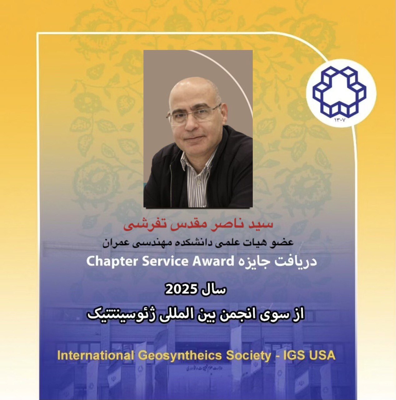به گزارش روابط عمومی ، دکتر سید ناصر مقدس تفرشی، استاد گروه مهندسی ژئوتکنیک دانشکده مهندسی عمران، موفق به دریافت جایزه Chapter Service Award سال 2025 از سوی انجمن بینالمللی ژئوسینتتیک (International Geosynthetics Society - IGS, USA) شد.